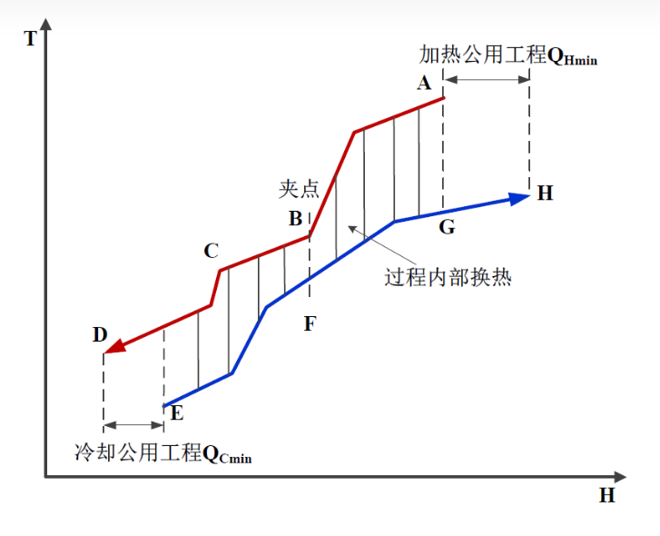 所谓“夹点”是指在温-焓(T-H)图上,热复合曲线和冷复合曲线之间的最小温差点。这个最小温差点能够确定流股热量的最大回收值,进而确定最优的操作费用。对于化工工艺过程,在生产运行中存在多股冷、热流股,而“夹点技术”正是基于热力学原理,并结合热流股需要冷却、冷流股需要加热的实际需求,实现流股间的热量交换,可有效节约大量的冷却水和蒸汽等。