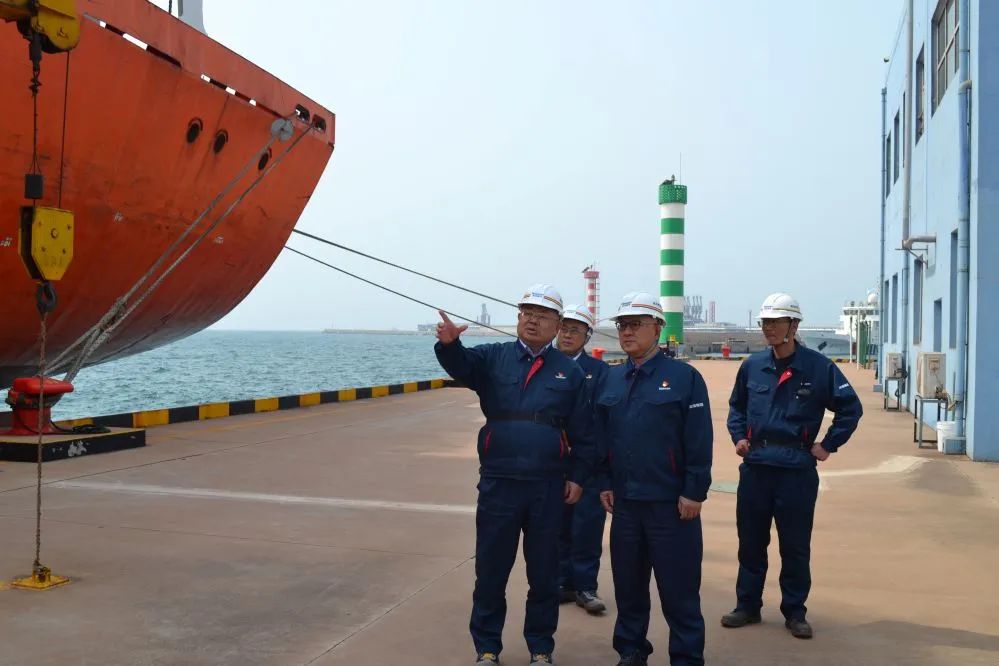 在海湾港务,李明一行来到液化码头1#泊位,实地查看现场船舶作业情况。他详细询问节日期间船舶计划,以及液碱装船、乙烯卸船等码头作业情况,同时还重点了解球罐定检施工作业进度、罐区液碱储罐建设前期相关工作及进度。