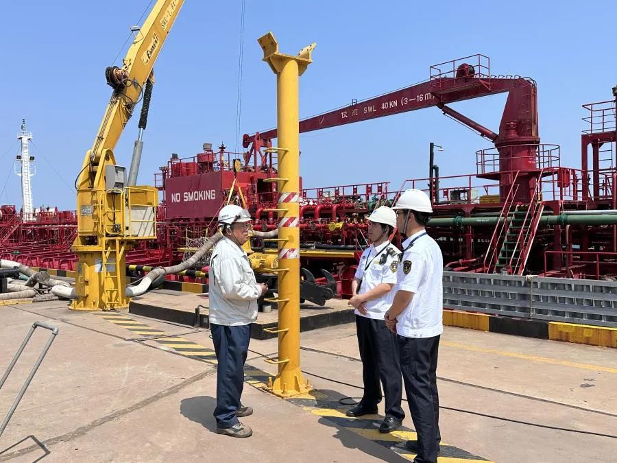 在作业过程中,港方与船方紧密配合,从船舶靠泊到管线对接、氮气试压、启泵装卸,整个流程高效完成,较原计划时间缩短20%。“这是我们首次接卸粗甘油,从手续办理到现场操作,各方协同效率远超预期,同时也是公司第九个货种投用。”海湾港务生产运营部部长助理潘洋洋表示。