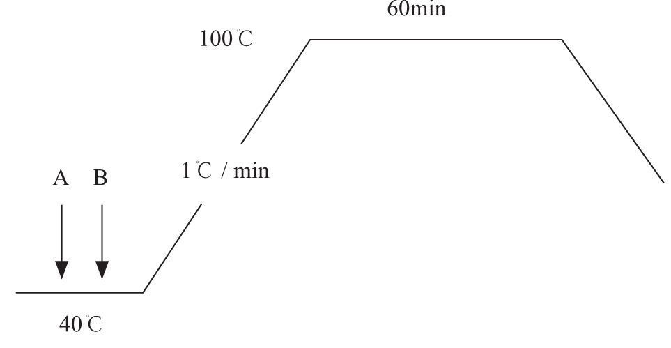 A:0.5g/l    渗透剂 CA、1%    匀染剂 OA、2g/l    醋酸钠、X%    醋酸、调节 pH=4.5-5.0   B:X% 染料