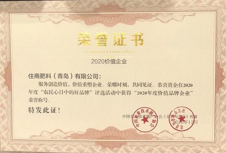 12月9日-10日,由《农资与市场》传媒主办的第23届中国农化行业领袖年度智慧峰会在西安成功召开。住商肥料受邀出席并荣获“2020年度农民心目中的好品牌”之“年度价值品牌”荣誉。